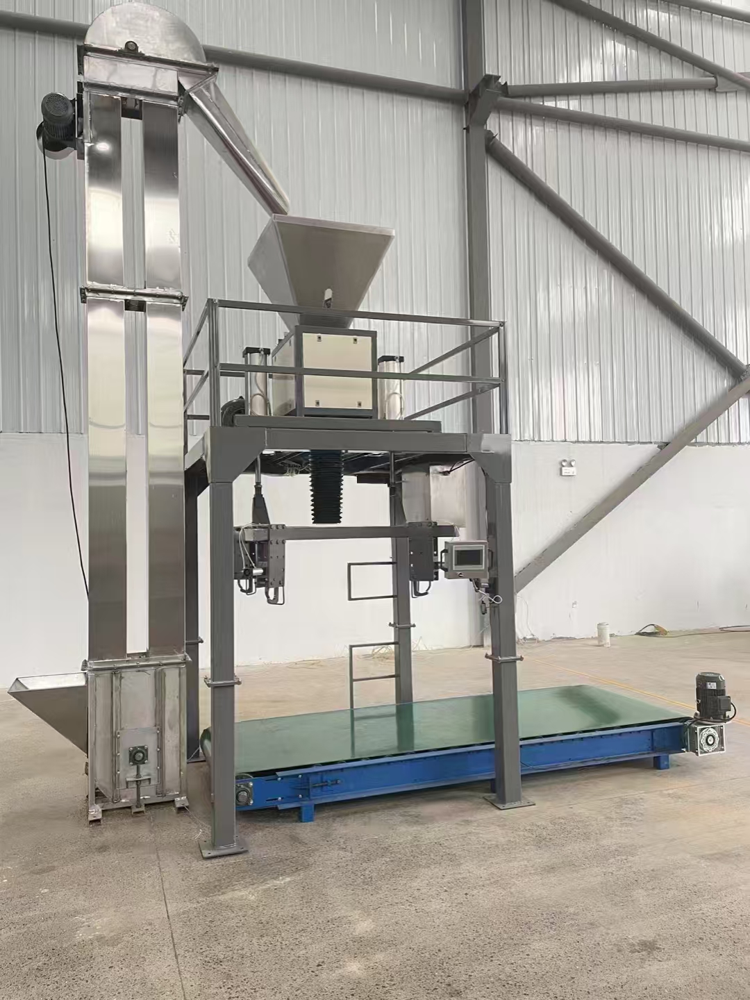 粉末定量噸包機采用單/雙螺旋強制給料控制系統(tǒng),無級變頻調(diào)速控制給料速度,快速給料由大小螺旋快速進料,慢速給料由小螺旋精加料完成,結(jié)合精度控制閥實現(xiàn)包裝速度和精度的自動控制,性能穩(wěn)定可靠。灌裝時只需人工掛袋,給定信號后,便可完成自動灌裝、自動計量、滿稱時自動停機、松袋的工作循環(huán), 由叉車或輸送機直接輸出后吊裝儲運。